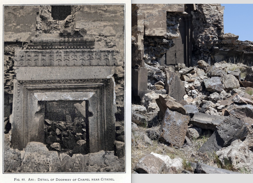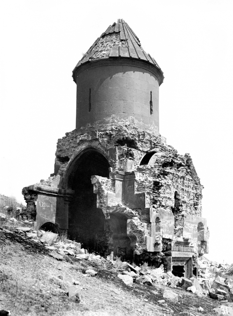 Située en contrebas de l’église Royale de la citadelle, l’église du Dôme a été construite entre le Xe et le XIe siècle. Sur les images d’archives du début du siècle dernier, nous distinguons la structure encore dressée de cette salle à coupole relativement bien conservée. Son tambour circulaire et sa couverture était présents jusque dans les années 1950, elle est en ruine aujourd’hui. La porte d’entrée se trouve dans le mur sud, elle était surmontée d’un linteau décoré de feuilles d’acanthe. Les murs nord, sud sont effondrés, seule la façade ouest et une partie du mur est sont visibles mais percés de brèches béantes. Des blocs de maçonnerie et des éléments du décor jonchent le sol.