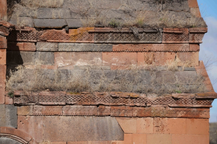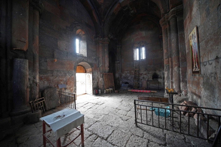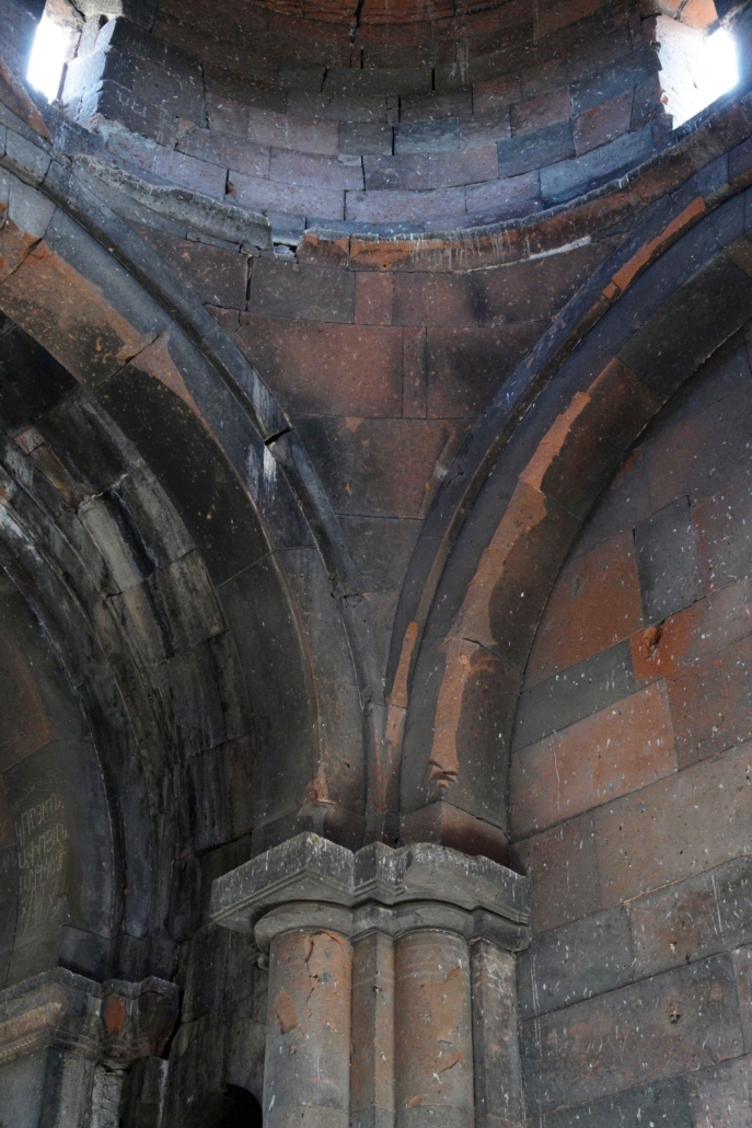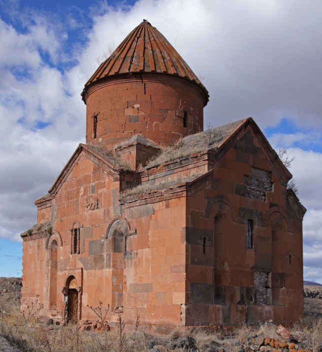 Le petit village d’Haykadzor est situé aux abords de la frontière entre la république d’Arménie et la Turquie. La magnifique église Saint-Grégoire-l’Illuminateur est située à proximité du village, mais dans la zone militarisée, il faut un laisser-passer pour y accéder. La porte d’entrée se trouve dans le mur sud, elle est encadrée par deux niches. Le portail est composé d’une double colonnette à boule surmontée d’un bandeau qui repose sur une base carrée. La façade sud percée d’une étroite fenêtre est recouverte d’une imposante inscription et décorée d’un bas-relief qui représente un lion stylisé. La façade ouest est percée d’une paire de fenêtres gémellées. Une large fissure parcoure la base du tambour jusqu’au sommet de la coupole, quelques plaques de parement sont manquantes sur la façade nord, mais l’ensemble du monument est bien conservé. La décoration sculptée se trouve principalement au niveau des fenêtres qui sont ornées d’une archivolte composée de tresses et de fleurons à rosace. Les corniches sont décorées d’une double rangée de vannerie et d’une tresse. A l’intérieur, le tambour repose sur des piliers engagés au moyen de pendentifs.